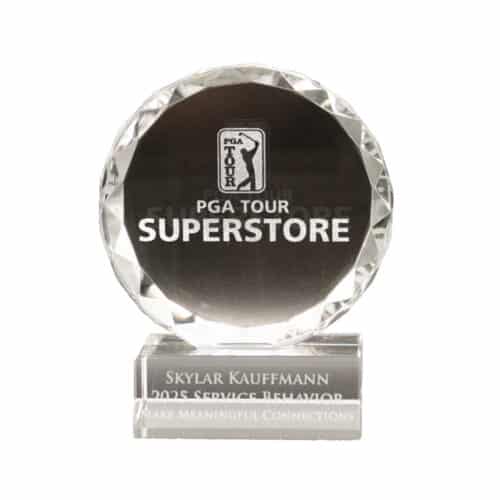 A 5¼" round facet crystal award set on a clear pedestal base, designed for elegant corporate or event recognition. Expertly etched with custom logos and text, it offers a timeless and sophisticated way to honor achievements.