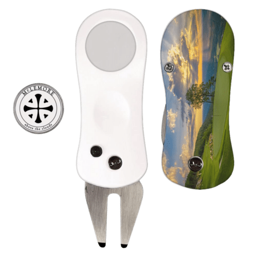 • The tuxedo track divot tool features an elegant tuxedo bow design, with a custom UV-printed logo on the magnetic ball marker. This stylish and functional tool helps repair divots while offering a personalized touch for a polished, professional look on the course.