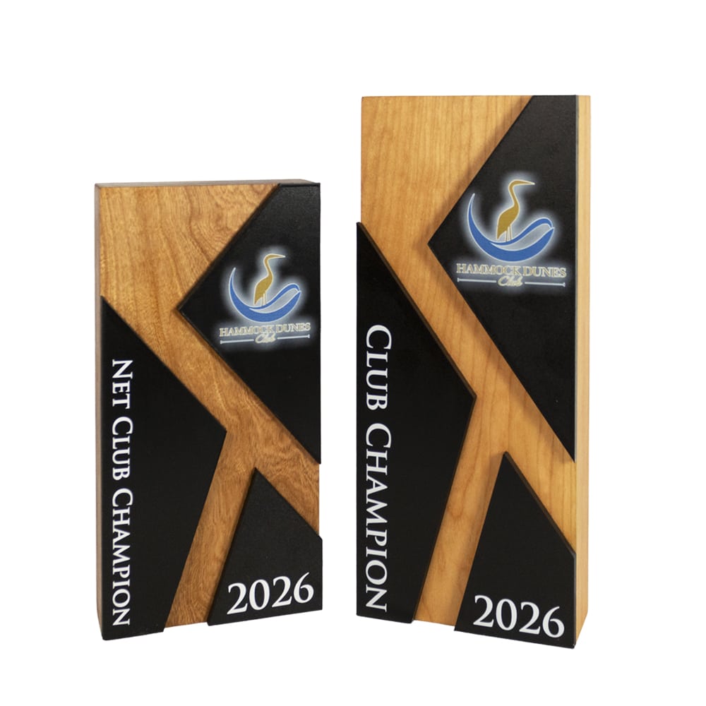 This award is a distinctive rectangular award features three scattered triangular black acrylic pieces, offering a modern touch and a dynamic visual contrast. Each acrylic piece can be custom UV printed with golf clubs’ logos or personalized text, making this award a unique and memorable recognition of excellence.