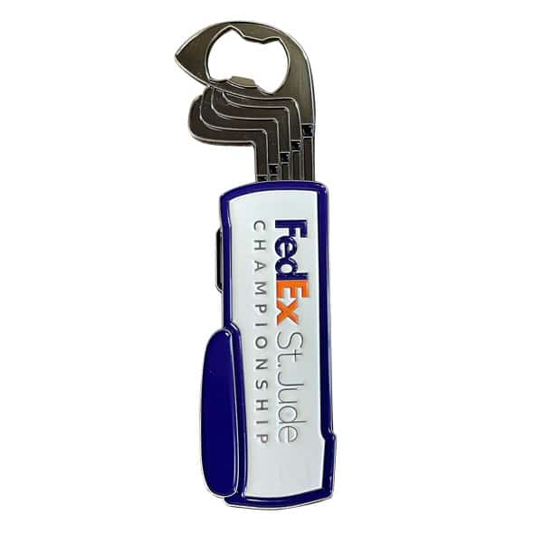This unique bottle opener is shaped like a golf bag with clubs – The driver being the opener.