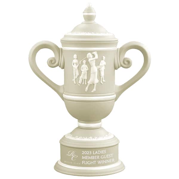 Classic trophy design. Handcrafted ceramic trophy with removable lid. Sculpted raised female figures. Club logo and text engraved.