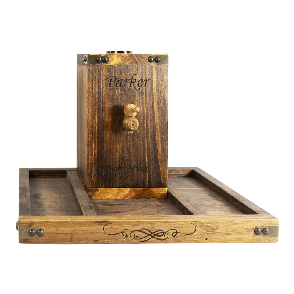 designed pour system • Custom spigot matches the solid oak construction • Nationally Registered Trademark • USPTO Reg# 556678