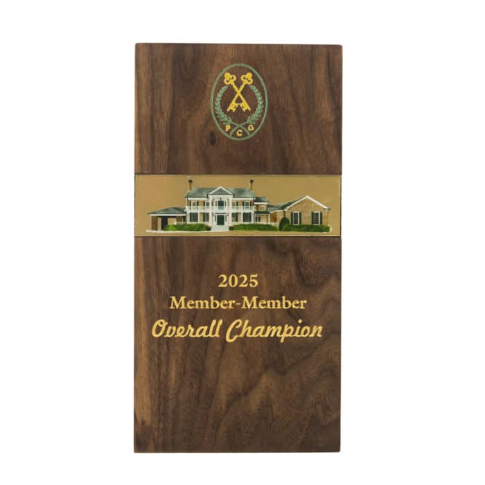 The Summit Award measures 5″x10″ and is a sleek, customizable recognition piece perfect for Hole-In-One achievements, member-member or member-guest championships, or any special accomplishment. Text and logos can be engraved or UV printed, while a clubhouse, hole image, or full course image is vividly UV printed on an acrylic panel backed with gold aluminum. A striking blend of detail and durability, this award delivers a premium presentation for any occasion.