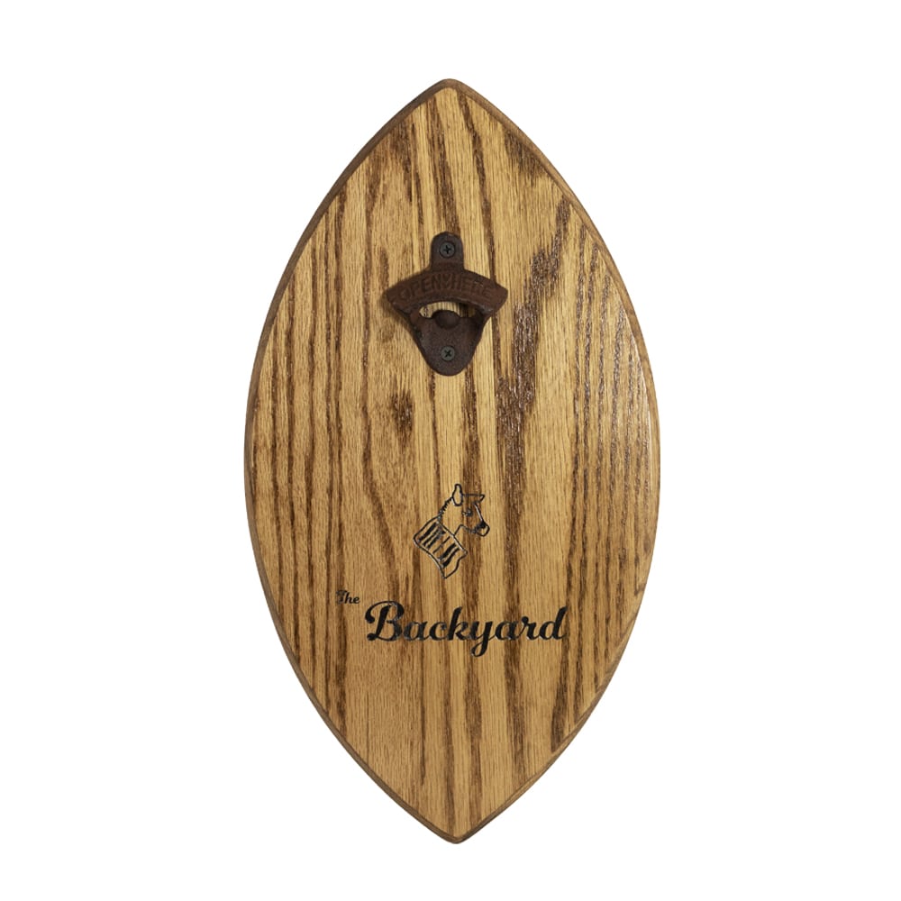 Reclaimed Kentucky bourbon barrels are used to produce this new product line. This wall hanging bottle opener measures 10″x18″ and is made from the lid of the whiskey barrel. Text and logos can be laser etched into the wood.